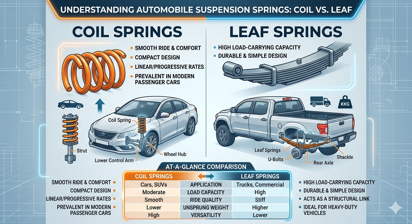 The dvije osnovne vrste opruge za ovjes automobila su zavojne opruge i lisnate opruge . Ove dvije komponente predstavljaju temeljnu tehnologiju koja se kiliisti za podupiranje težine vozila i apsorbiranje udarca na cesti u velikoj većini modernih i klasičnih automobilskih dizajna. Dok postoje drugi sustavi kao što su zračne opruge ili torzijske poluge, varijacije zavojnica i listova ostaju industrijski stiardi zbog svoje pouzdanosti, isplativosti i dokazanih performansi tijekom desetljeća inženjerske evolucije.
